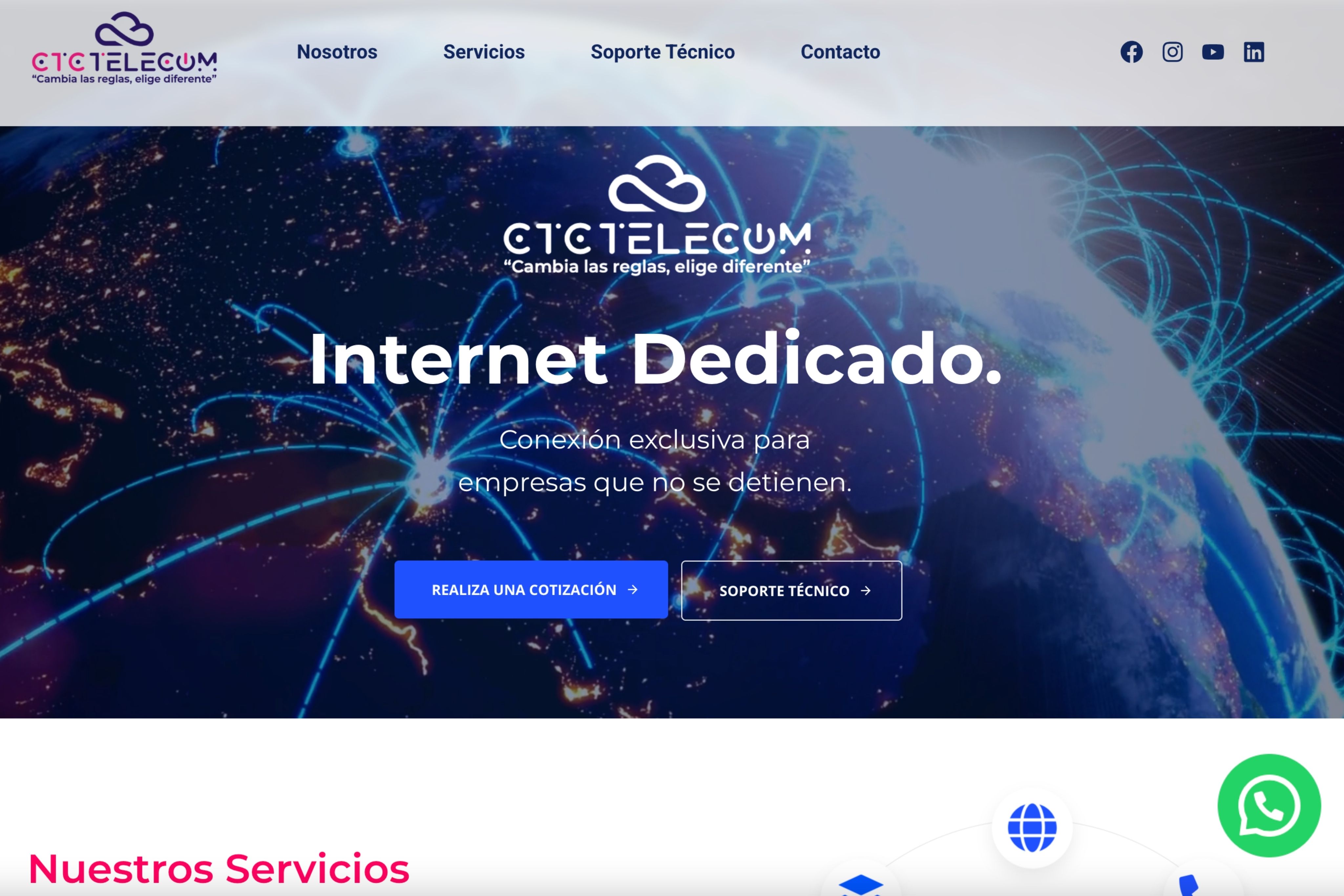 CTC Telecom, un carrier 100% mexicano, buscaba fortalecer su presencia digital y comunicar de manera clara la confiabilidad y alto rendimiento de sus servicios de internet dedicado, fibra óptica y telefonía IP. Necesitaban un sitio web profesional que destacara su infraestructura propia, el monitoreo 24/7 de su red y la atención cercana a sus clientes, transmitiendo confianza y eficiencia en cada interacción digital.
